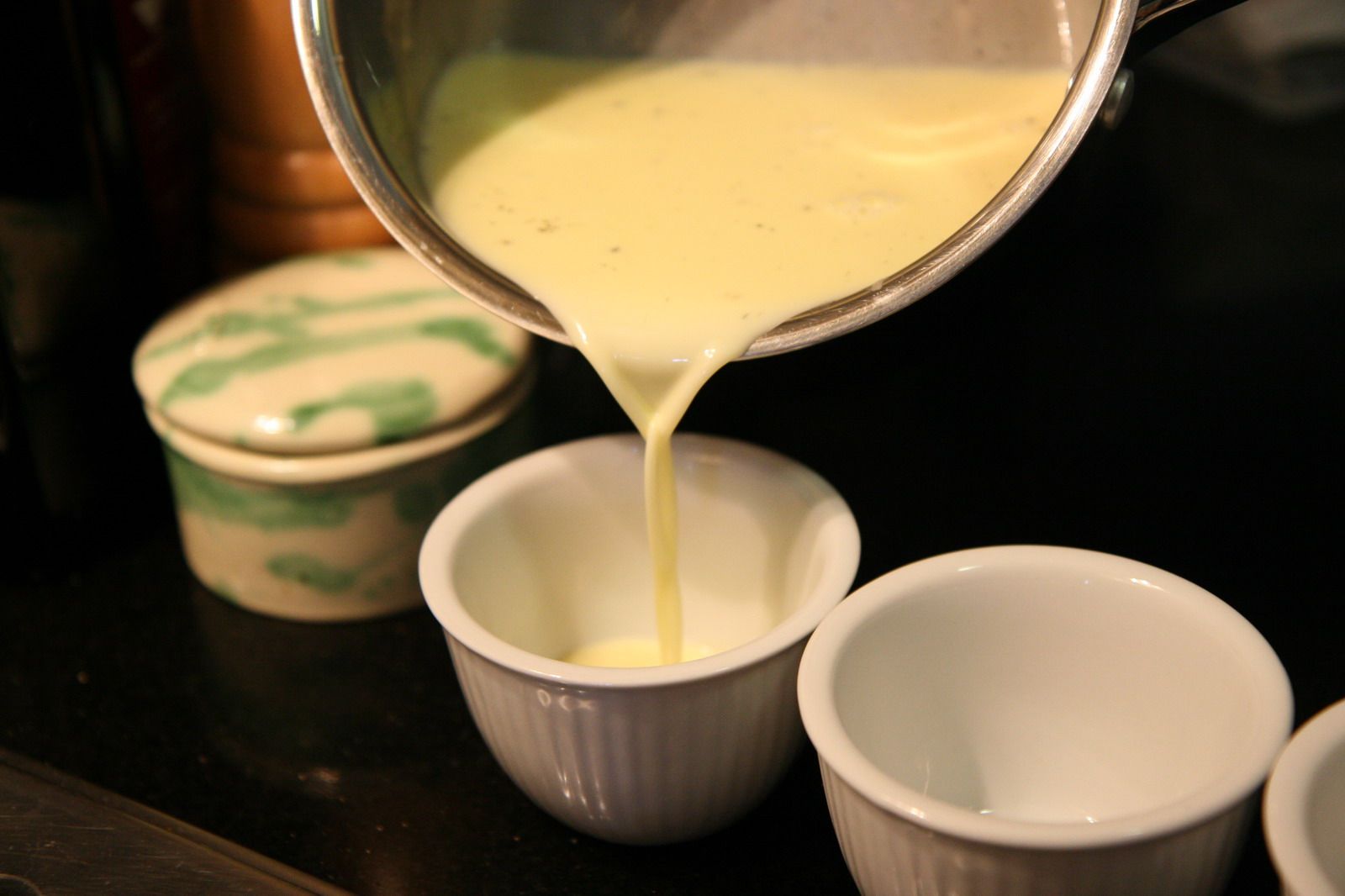 - V večji ponvi segrejte sladko smetano, granulirani sladkor in izdobljena semena vanilije. Prinesite do vrenja, nato pa zmanjšajte ogenj in kuhajte še približno 2 minuti, da se okusi združijo. Odstranite vanilijeva stroka.