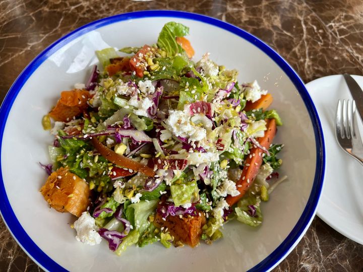 - Grški Lahanosalata: To je tradicionalna grška solata, ki vključuje dušeno rdeče zelje, čebulo, paradižnik, olivno olje, vino, limonin sok in sol. Lahko jo postrežemo kot prilogo k grškemu pečenemu mesu ali kot del meze (grške mezze).
